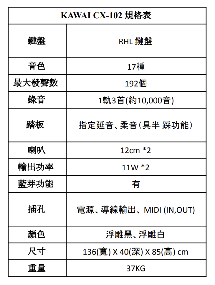 CX-102 你的超值音樂夥伴!CX-102 是 KAWAI 家用電鋼琴最初階成員,將真實的加重鍵鍵盤動作和逼真的平台鋼琴音色,結合在一個平價入門的包裝中。CX-102 最讓人心動的是,鋼琴音色是收錄KAWAI SK平台鋼琴,琴鍵的穩定度也改良很多,非常物超所值 ! 吸引人的是預算比 CN 系列入門款 CN201 便宜一萬元,是 KAWAI 超高 CP 值的熱賣款式!