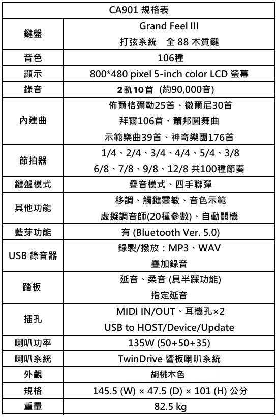 改款自前代 CA99、增加雙晶片音源技術、新款喇叭系統的 CA901,無論聲音立體度與音色都是頂級響宴。最大特色是它牌所沒有的 TWIN DRIVE 響板揚聲器,這酷東西能將數位聲音訊號與喇叭的能量傳輸到木頭響板上,產生出更豐富有層次的聲音,讓演奏者沉浸在最接近真實鋼琴的演奏體驗中,是對音質有極致追求的你極佳選項!