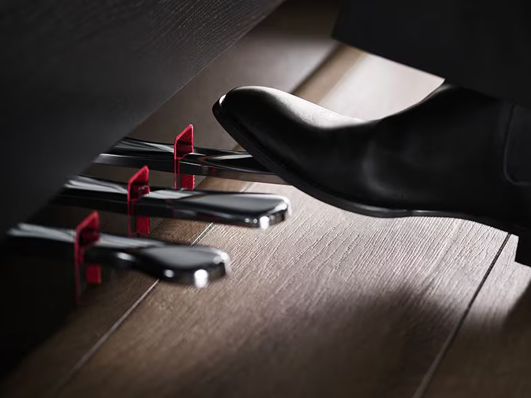 GrandTouch 踏板設計特別模擬平台鋼琴的「阻力感」:踩下去要點力但放開的時候會變輕盈,就像真的在控制鋼琴裡的制音器。可以精細控制半踩、慢踩的力道,做出更細膩的音色變化。還有高階型號才有的「GP 感應式延音器」:一開始踩下去比較輕,但踩到一半會開始變重,就像平台鋼琴真正開始延音的那個點,讓你能真正「感覺得到聲音變化」。