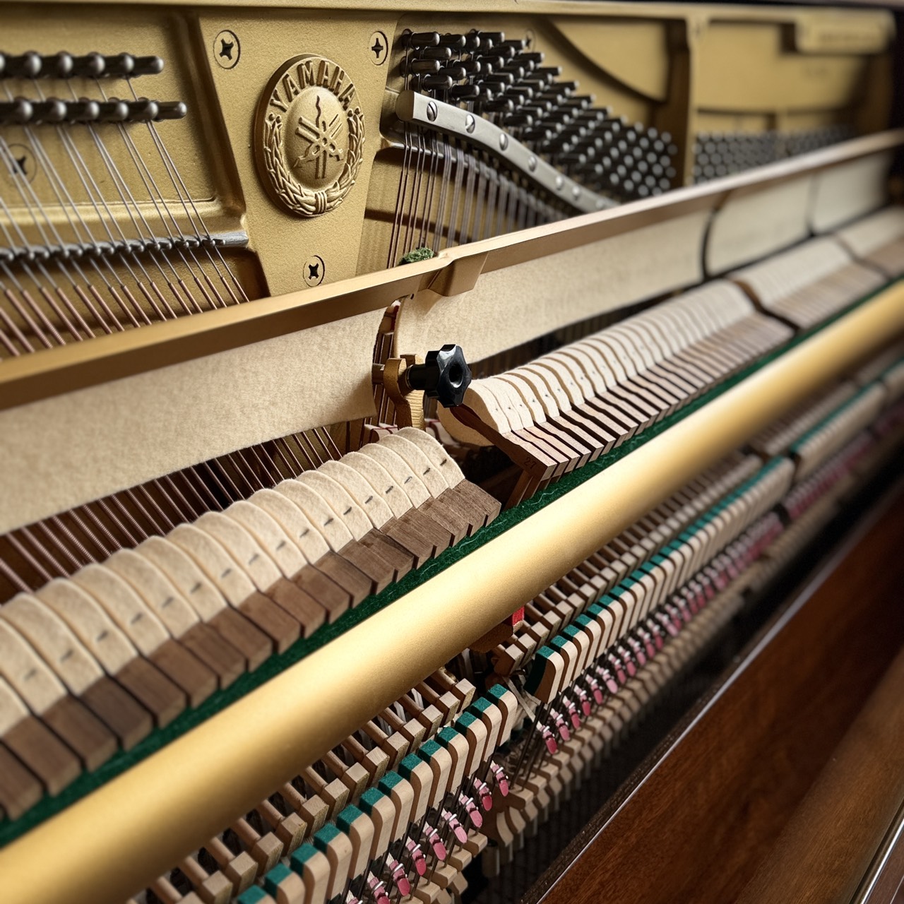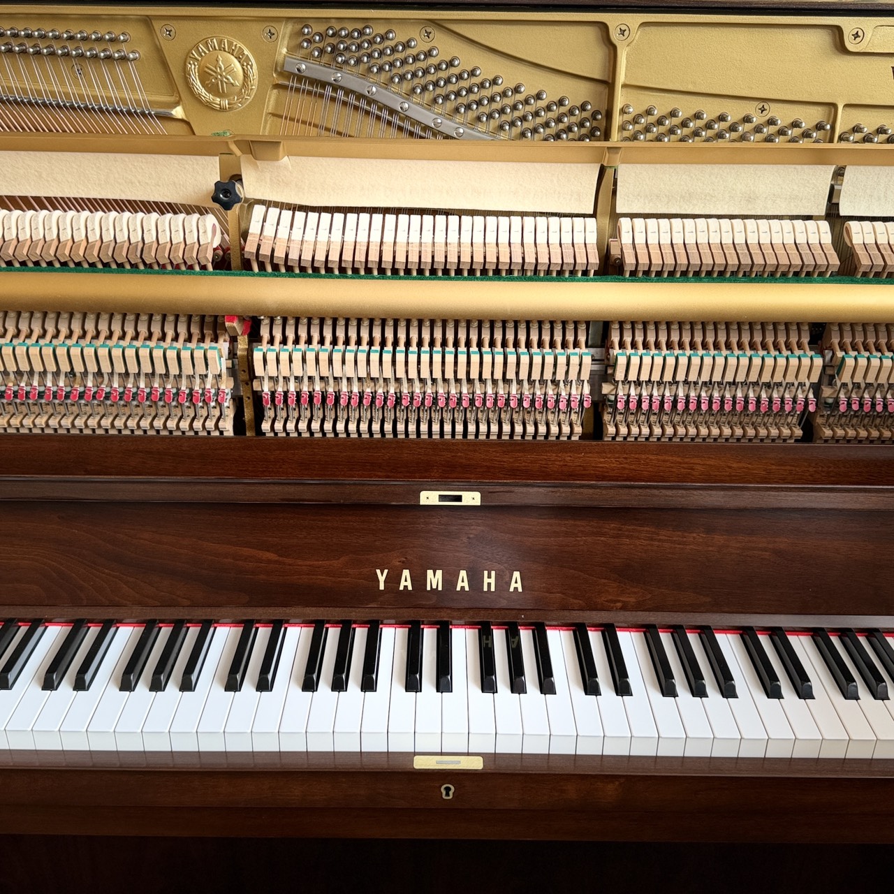 這台來自 YAMAHA 日本原裝的高檔直立鋼琴,是早期第二代採用「輔助共鳴箱譜架設計」的經典款式,堪稱當年頂規中的頂規。